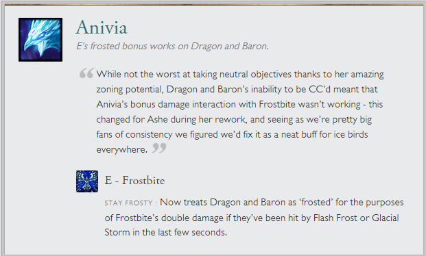 Self-explanatory, a buff to Anivia’s objective control. This buff is relatively minor and will not propel her anywhere near a tier 1 pick for mid. This change does absolutely nothing to address her irrelevance pre-mid game and buffs her already strong late-game, which, if she never gets to, renders this change largely moot.