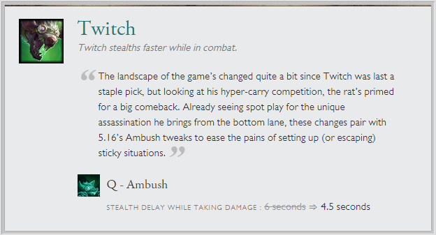 Whilst I wouldn’t call this a huge buff, this definitely makes it so that Twitch can actually escape from some situations rather than just dying in the intermediate time it takes for his ambush to activate. This is probably more of an early to mid-game buff than anything else