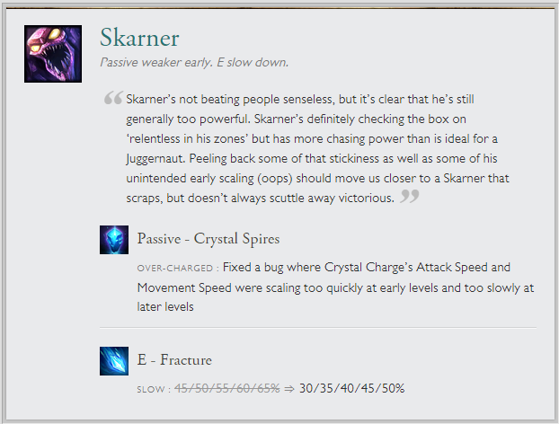 Honestly, this is the one nerf this patch that I say I’ll disagree with. I think Skarner’s relative jungle strength was actually quite on point. Actually, compared to some other top tier jungle picks I’d say he was quite weak. Not sure what the purpose of this nerf was.