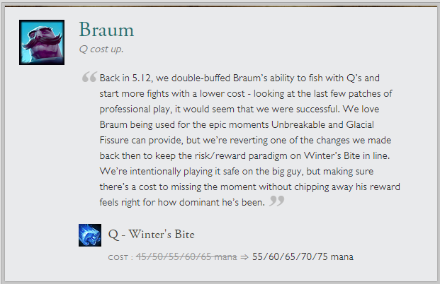 Braum’s prominence in the current meta has come from the power of his Unbreakable and the amount of damage that it can block during team-fights. Hitting his laning phase via the increased mana cost of his harass tool actually helps to punish him early which makes sense if he’s going to be increasingly valuable as the game goes on.