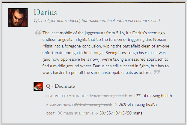 Not a lot to see here; hopefully top laners won’t snowball out of control by the 10 minute mark, but that remains to be seen. Overall this patch will be more balanced than the last 2 but comparatively (to 5.15) still needs a bit of work in order to not only balance champions but to balance the established roles within the meta. Solo queue is solo queue, anything goes but at least this patch makes it so that there will hopefully be some variance in the drafting phase.