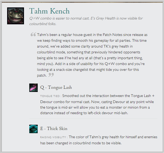 In all likelihood, Tahm was going to be played regardless of these QoL changes during Worlds. I suppose it’s nice that they’re making his combo’s somewhat easier(?).