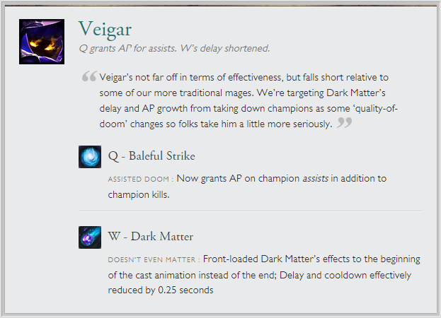 Interesting change to Dark Matter; might actually make it more self-sufficient and not as reliant on his stun. Will have to wait and see if his popularity increases at all or if it’s just another step to making Veigar viable.