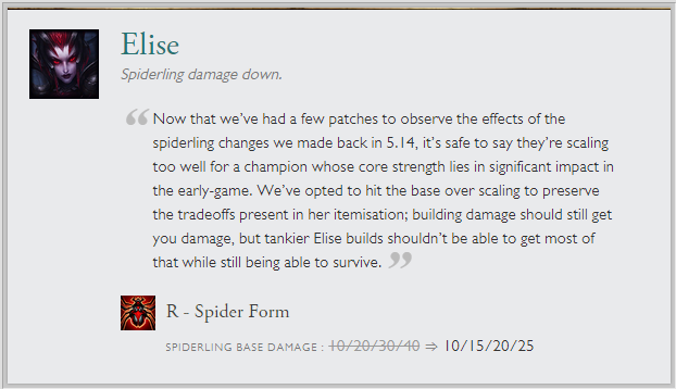 Necessary nerf considering the actual damage potential of her spiderlings at max level. Hopefully she won’t be able to one-shot me with 2 items anymore.