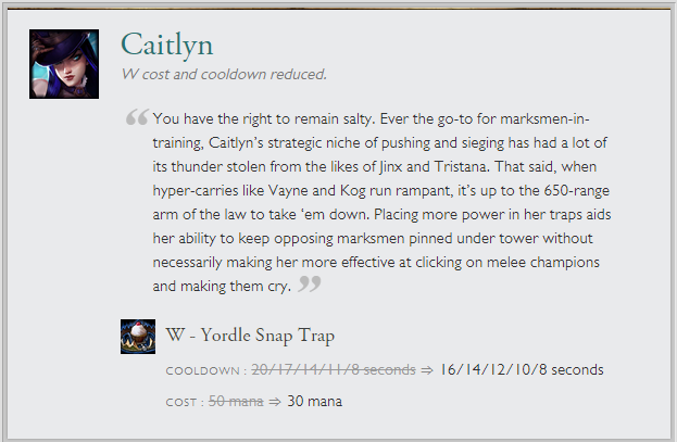 Caitlyn’s niche has always been lane control and relatively safe sieging and her downfall has always been that she just doesn’t do enough elsewhere, that her strengths are easily negated and that other champions provide what she does (albeit on a lesser scale) but also provide something extra. Buffing her traps makes her more valuable in very specific circumstances. In short – this change is irrelevant.
